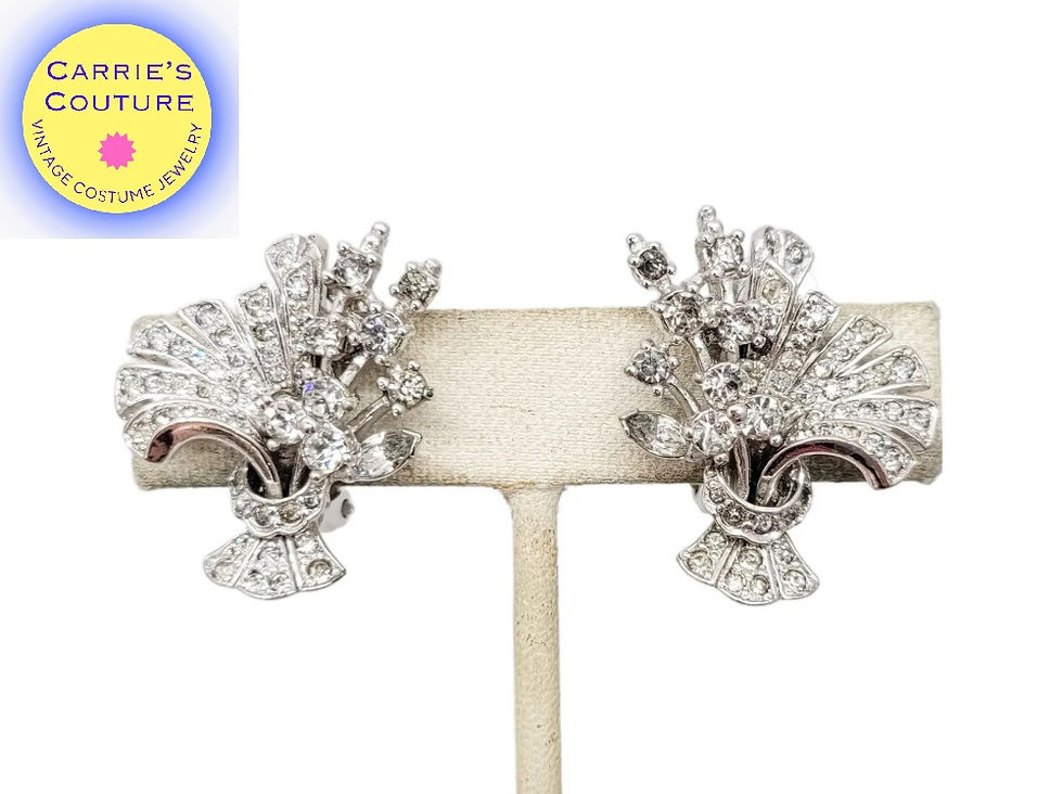 Vintage 1950s Signed Pennino Clear Rhinestone Floral Spray Clip Earrings
