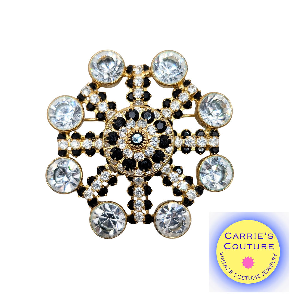 Vintage 1960s Signed Hobe Goldtone Faux-Onyx & Clear Rhinestone Brooch